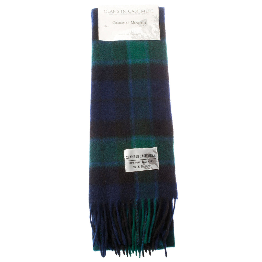 CLANS OF SCOTLAND Cashmere Clan Tartan Scarf. Timeless and luxurious, this beautifully crafted tartan scarf is made from pure cashmere. The use of finest cashmere makes it an exquisite garment with an extra-soft finish. The packaging includes a clan history and motto at the back. This scarf is a fantastic souvenir from Scotland either for yourself or your beloved ones.